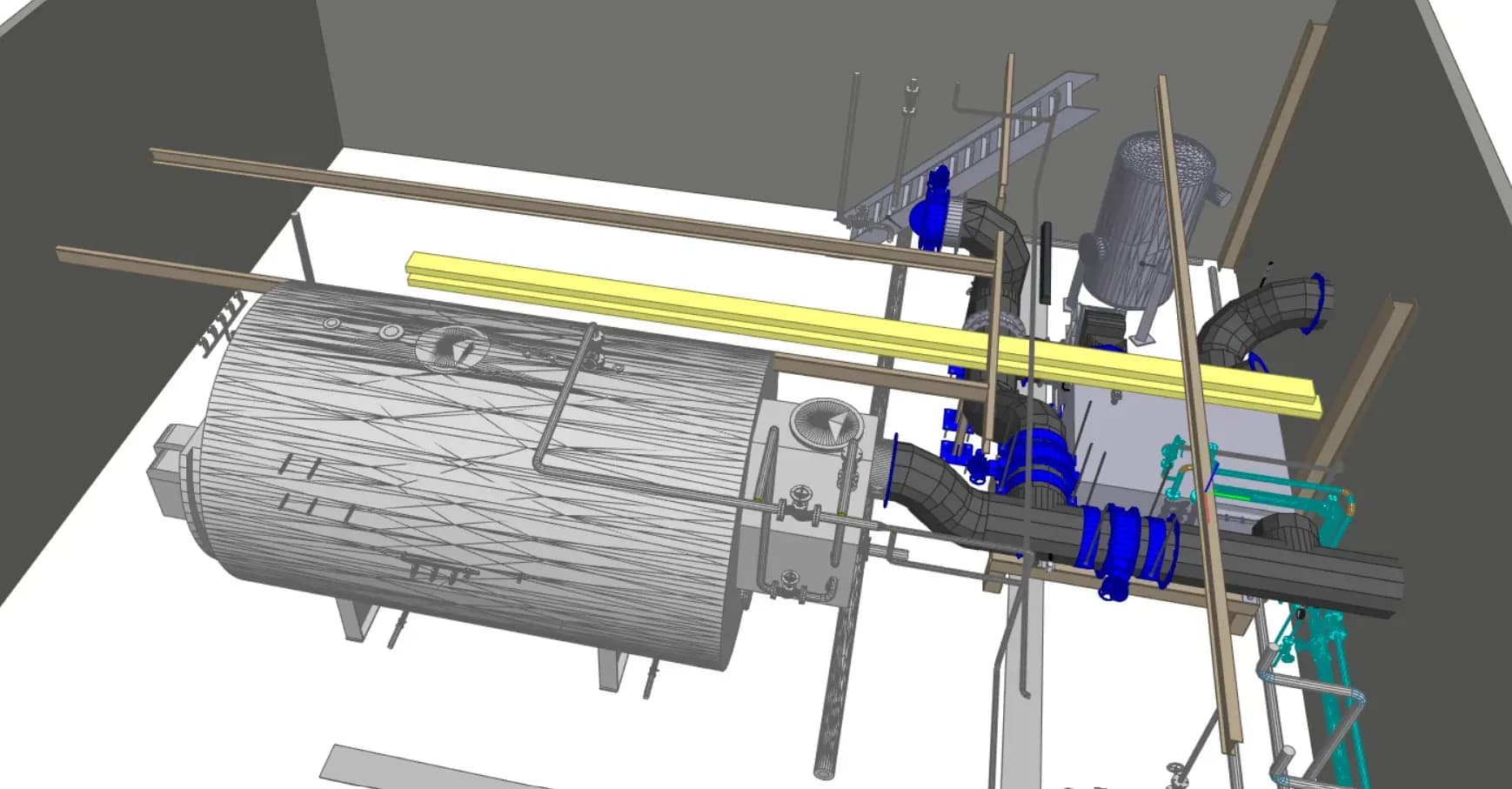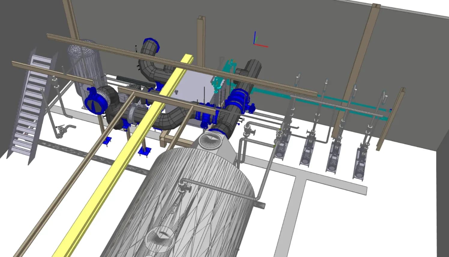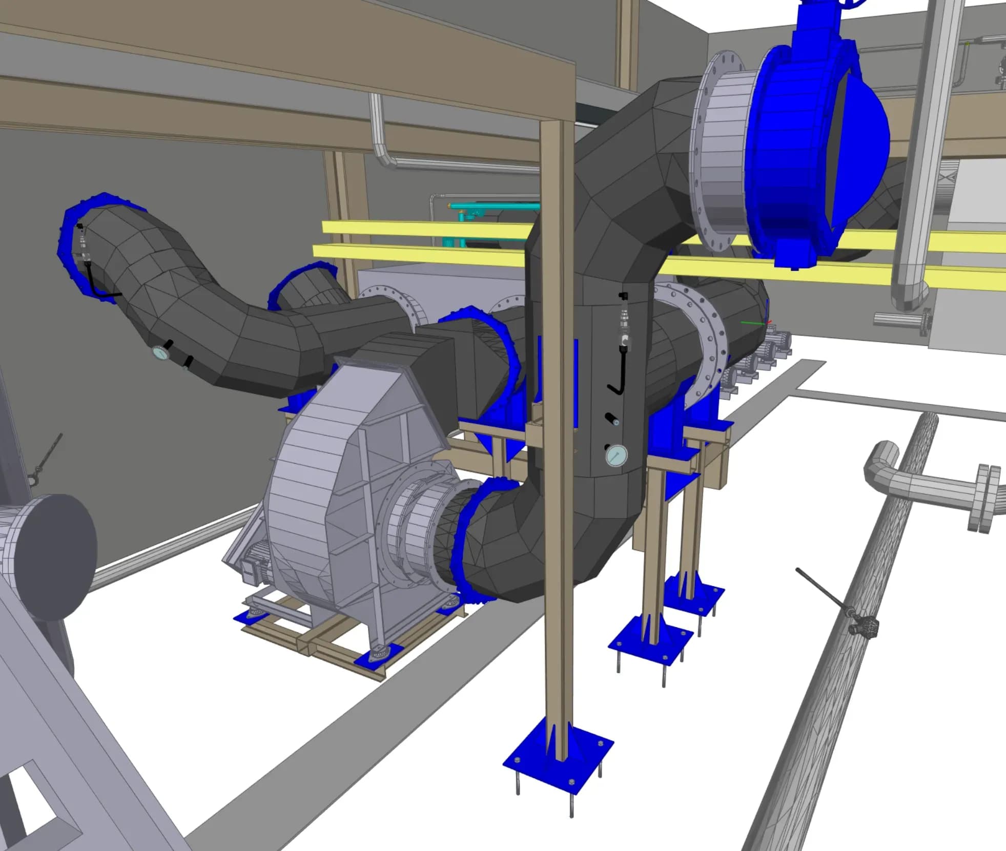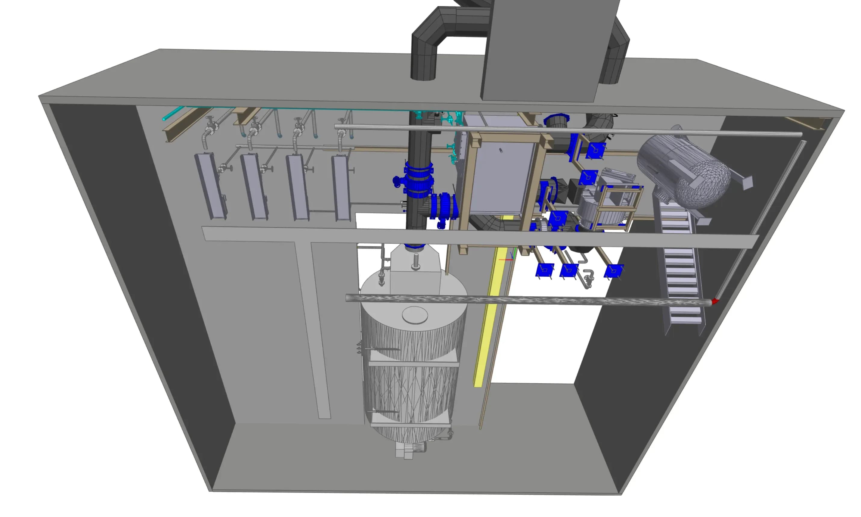 Auf Basis der 3D-Scandaten wurde der Bestand inklusive aller betroffenen Anlagenteile modelliert. Dies ermöglichte die reibungslose Integration der neuen Technik in die vorhandene Infrastruktur und verhinderte spätere Kollisionen im Bauablauf.
