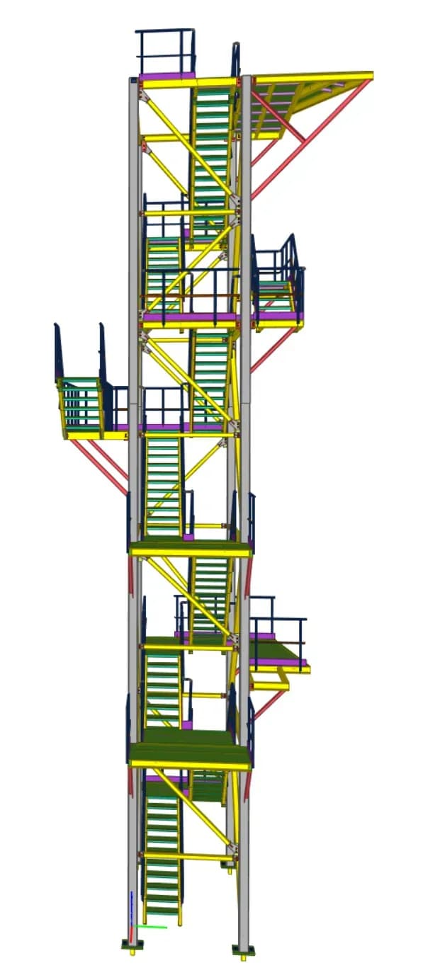Eine der größten Herausforderungen war die exakte Anpassung des Treppenturms an die bereits vorhandenen Strukturen des Gebäudes und das begrenzte Platzangebot am Standort. Zusätzlich erschwerten die strengen Sicherheits- und Belastungsvorgaben die statische Planung, da der Turm sowohl hohen Lasten als auch unterschiedlichen Witterungsbedingungen standhalten muss. Die Koordination zwischen den verschiedenen Planungsphasen sowie die Berücksichtigung aller technischen und sicherheitsrelevanten Anforderungen war daher besonders anspruchsvoll und erforderte eine enge Abstimmung mit allen Projektbeteiligten.