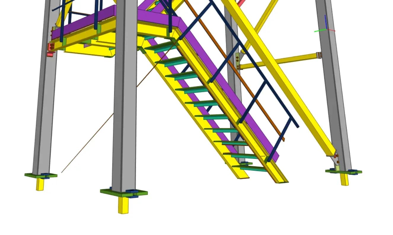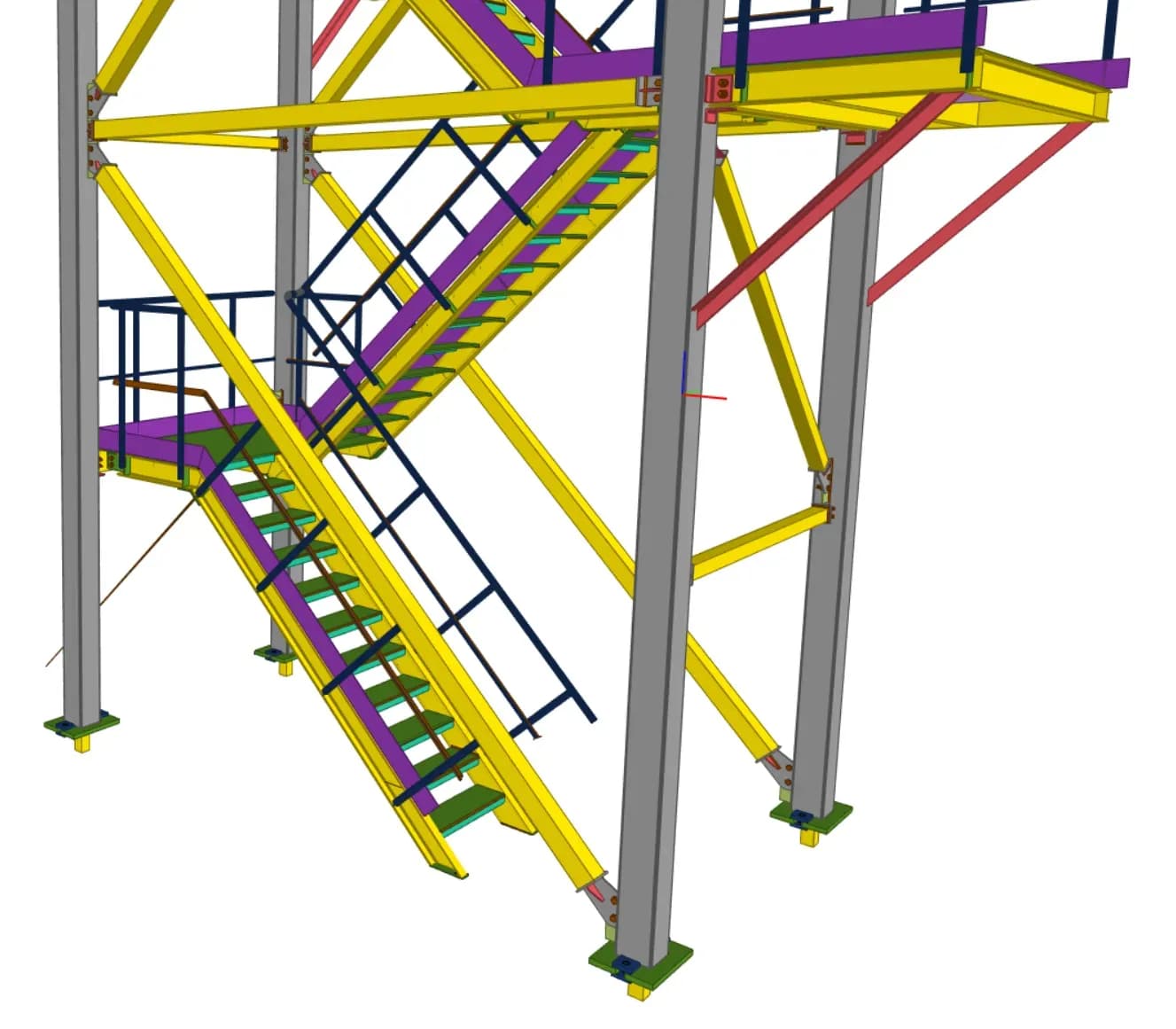 Im Rahmen eines Industrieprojekts im bayerischen Raum wurde von unserem Ingenieurbüro ein Treppenturm aus Stahl geplant. Die Stahlkonstruktion dient als Zugangslösung für verschiedene Ebenen eines Industriegebäudes und ermöglicht einen sicheren und effizienten Zugang für das Wartungspersonal und technische Inspektionen. Unser Leistungsumfang umfasste eine detaillierte Bestandsaufnahme der örtlichen Gegebenheiten, die Entwicklung eines präzisen digitalen Modells sowie die Durchführung statischer Berechnungen zur Gewährleistung der strukturellen Sicherheit. Zudem haben wir Werkstatt- und Montagepläne erstellt, die alle Anforderungen an Material, Verbindungen und Montagesequenzen berücksichtigen, um eine reibungslose Fertigung und Installation zu gewährleisten.